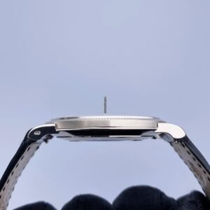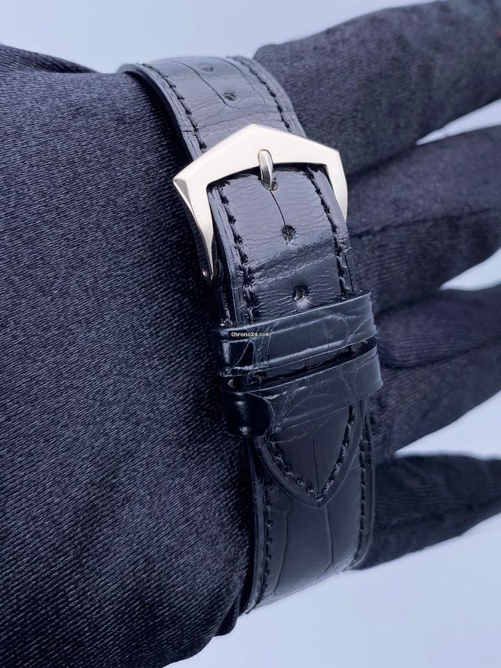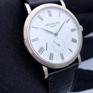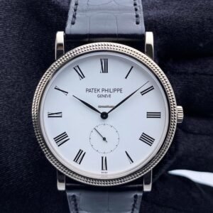 Patek Philippe Calatrava 5119G-001 Mens Watch. 36mm 18K white gold case. 18K white gold hobnail patterned bezel. White dial with black hands and black Roman numeral hour markers. Small second dial display at 6 o’clock position. Black leather Patek strap with 18K white gold buckle. Will fit up to a 7.5-inch wrist. Sapphire crystal. Transparent sapphire crystal case back. Calibre 215 mechanical hand-winding movement. This watch is backed by our two year warranty. |
